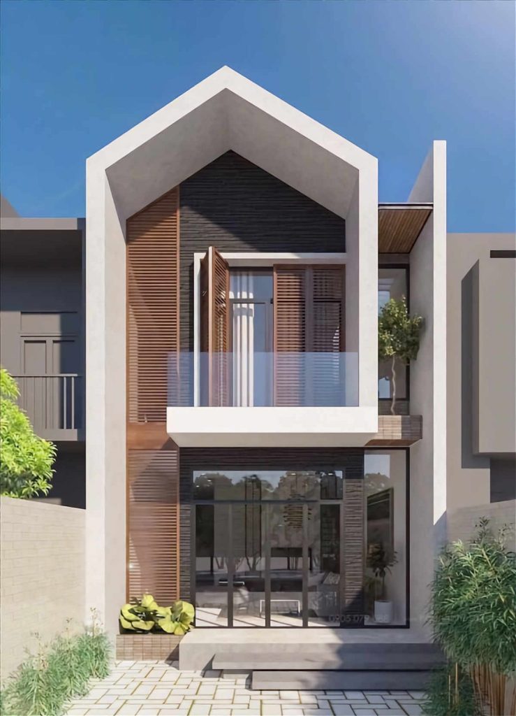 Mẫu nhà 2 tầng độc đáo và mới lạ trong thiết kế mái dốc phá cách. Được tạo nên từ 3 màu tương phản nhau rõ rệt, hình khối mẫu nhà ống 2 tầng 90m2 tạo cảm giác dễ chịu, gần gũi. Mặt tiền được trang trí những mảng nâu tựa như những thanh gỗ ghép lại nhưng thực tế lại được làm từ chính bê tông xi măng.