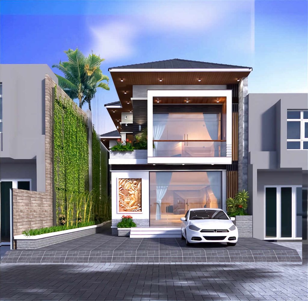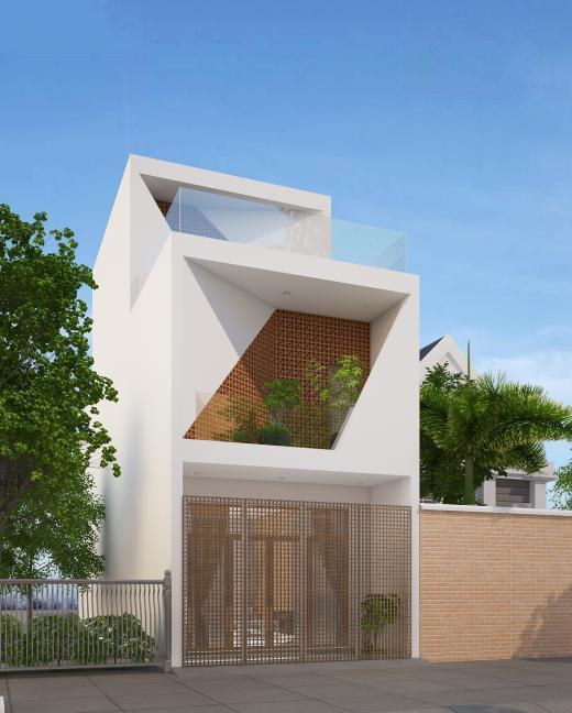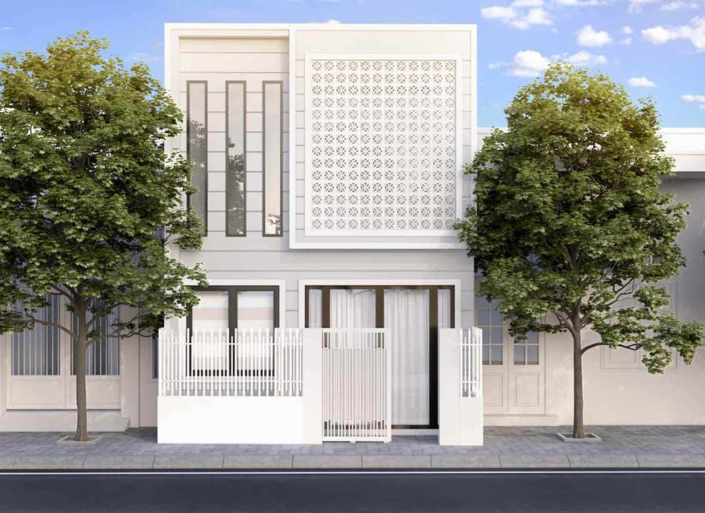 Mẫu nhà đẹp đầu tiên gây ấn tượng với mặt tiền có màu trắng trang nhã, trẻ trung với hiệu ứng xếp tầng lạ mắt. Với sự sáng tạo trong phối cảnh mặt tiền độc đáo, cách thiết kế lấy ánh sáng tự nhiên thông minh, kín đáo, mẫu nhà ống 2 tầng 90m2 hứa hẹn đem lại không gian sống lý tưởng cho các gia đình trẻ.