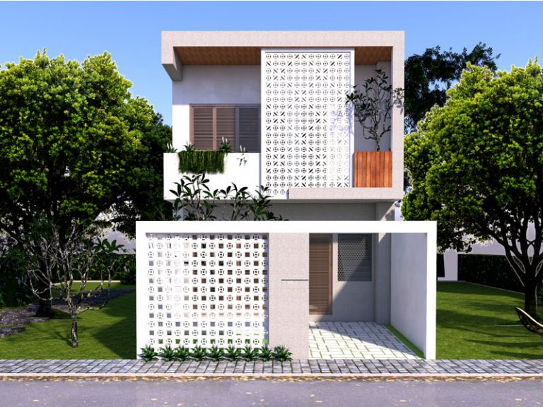 Mẫu nhà ống 2 tầng 90m2 được thiết kế với khoảng sân phía trước nhà rộng. Đây chính là không gian vừa để làm nơi để xe lại có thể làm không gian vui chơi. Bên cạnh đó mẫu nhà này còn sử dụng hệ thống cửa gỗ kết hợp với gạch bông gió tạo được độ tương phản và hài hòa.
