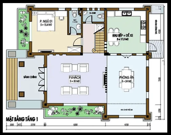 Tầng 1 gồm: Phòng khách, phòng ăn, nhà bếp + để xe, phòng ngủ 1.