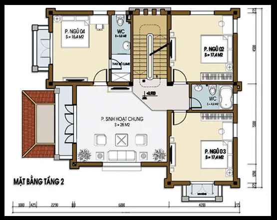 Tầng 2 gồm: Phòng sinh hoạt chung, 3 phòng ngủ.