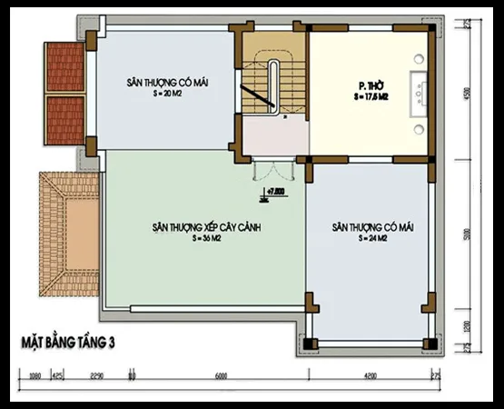 Mặt bằng tầng 3 gồm: Phòng thờ, sân thượng có mái che và sân thượng ngoài trời